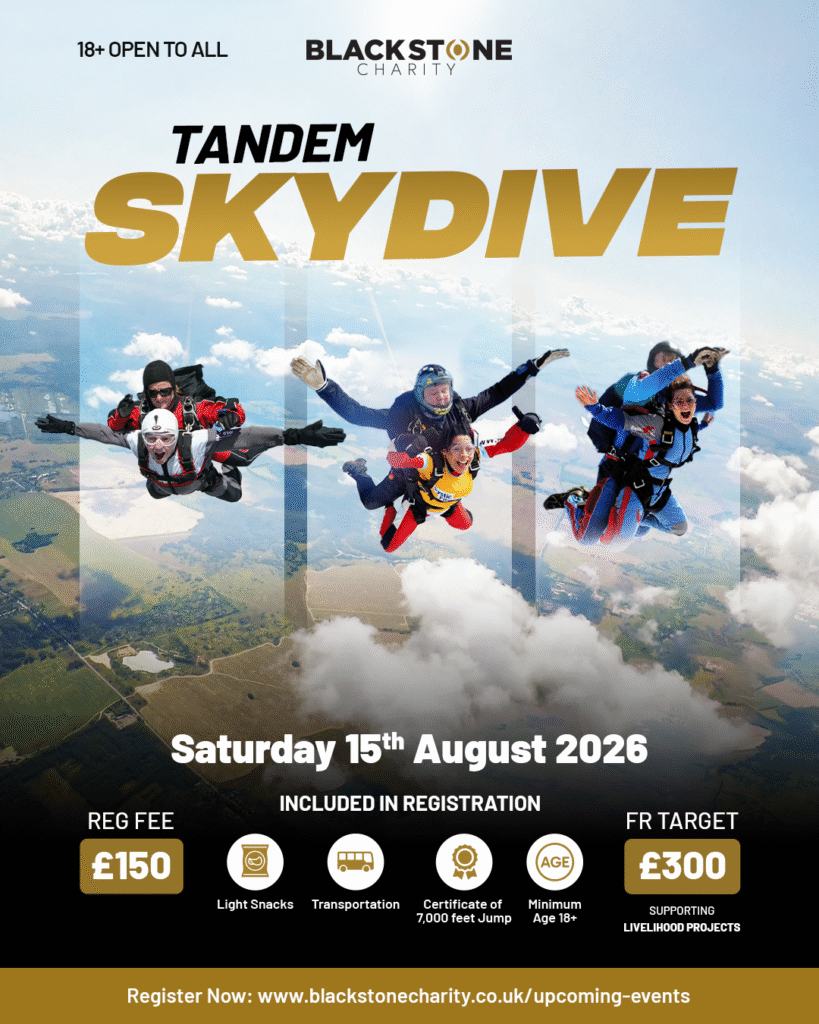 The Tadem Skydive is raising funds for Blackstone Charity’s Sustainable Income Businesses initiative, which empowers vulnerable individuals and families to start small, practical businesses that provide steady income. From food carts to market stalls, these ventures are tailored to people’s skills and circumstances, helping them earn with dignity, send children to school, access healthcare, and break free from the cycle of poverty. Your support will help launch more of these life-changing businesses, building stronger, more self-reliant communities for the future.